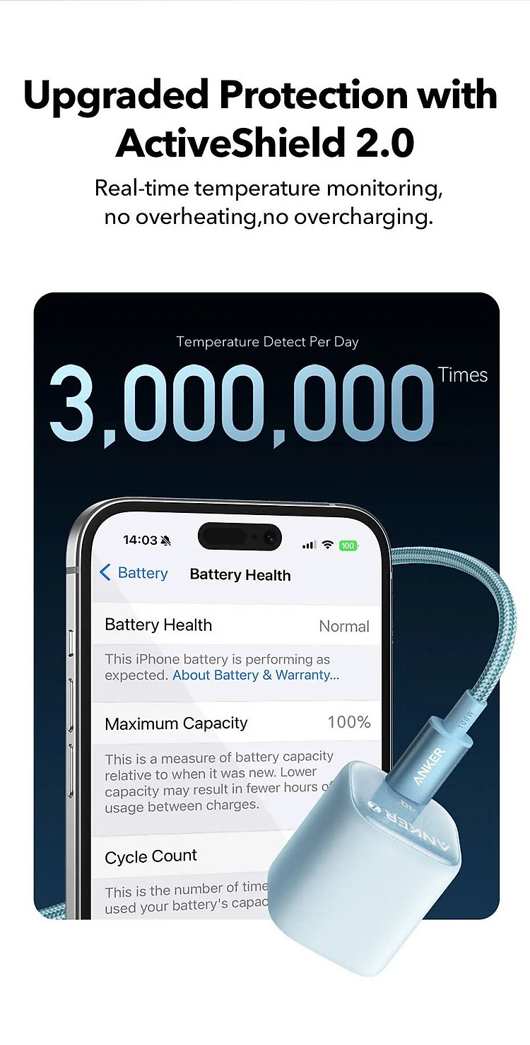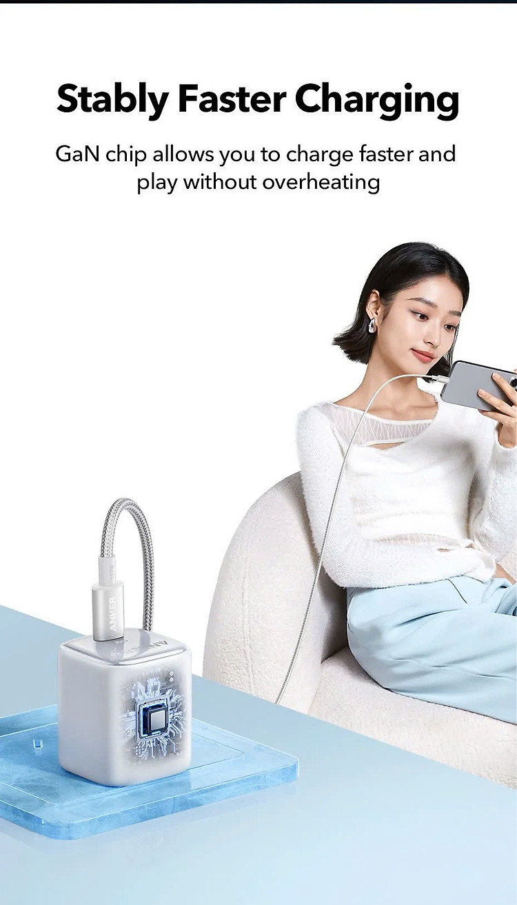 Anker luôn chú trọng đến sự an toàn của người dùng. Củ sạc Zolo A2698 tích hợp các tính năng bảo vệ chống quá dòng, quá áp, quá nhiệt và ngắn mạch, giúp bạn yên tâm khi sạc thiết bị.