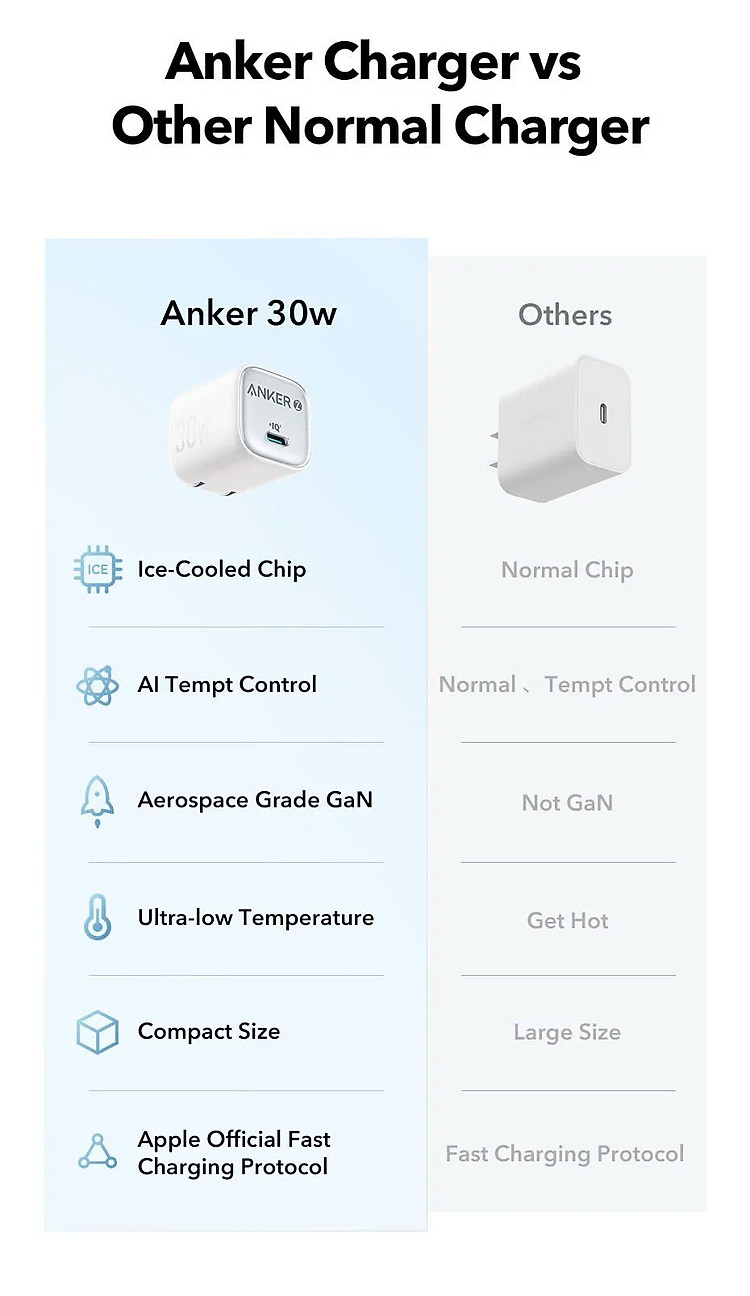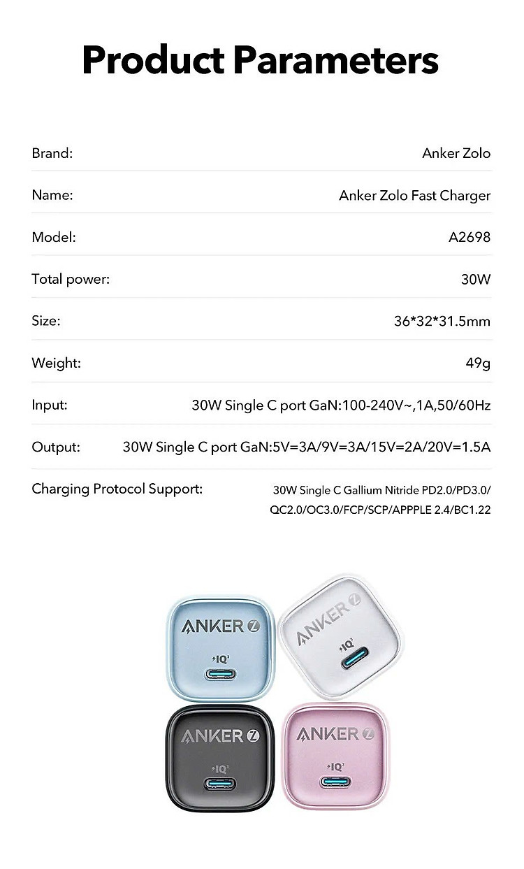 Với công suất 30W, củ sạc Anker Zolo A2698 hỗ trợ công nghệ Power Delivery (PD), cho phép bạn sạc nhanh các thiết bị tương thích như iP(từ iP 8 trở lên), iPad Pro và nhiều dòng điện thoại Android cao cấp. Bạn sẽ tiết kiệm được đáng kể thời gian sạc so với các củ sạc thông thường.