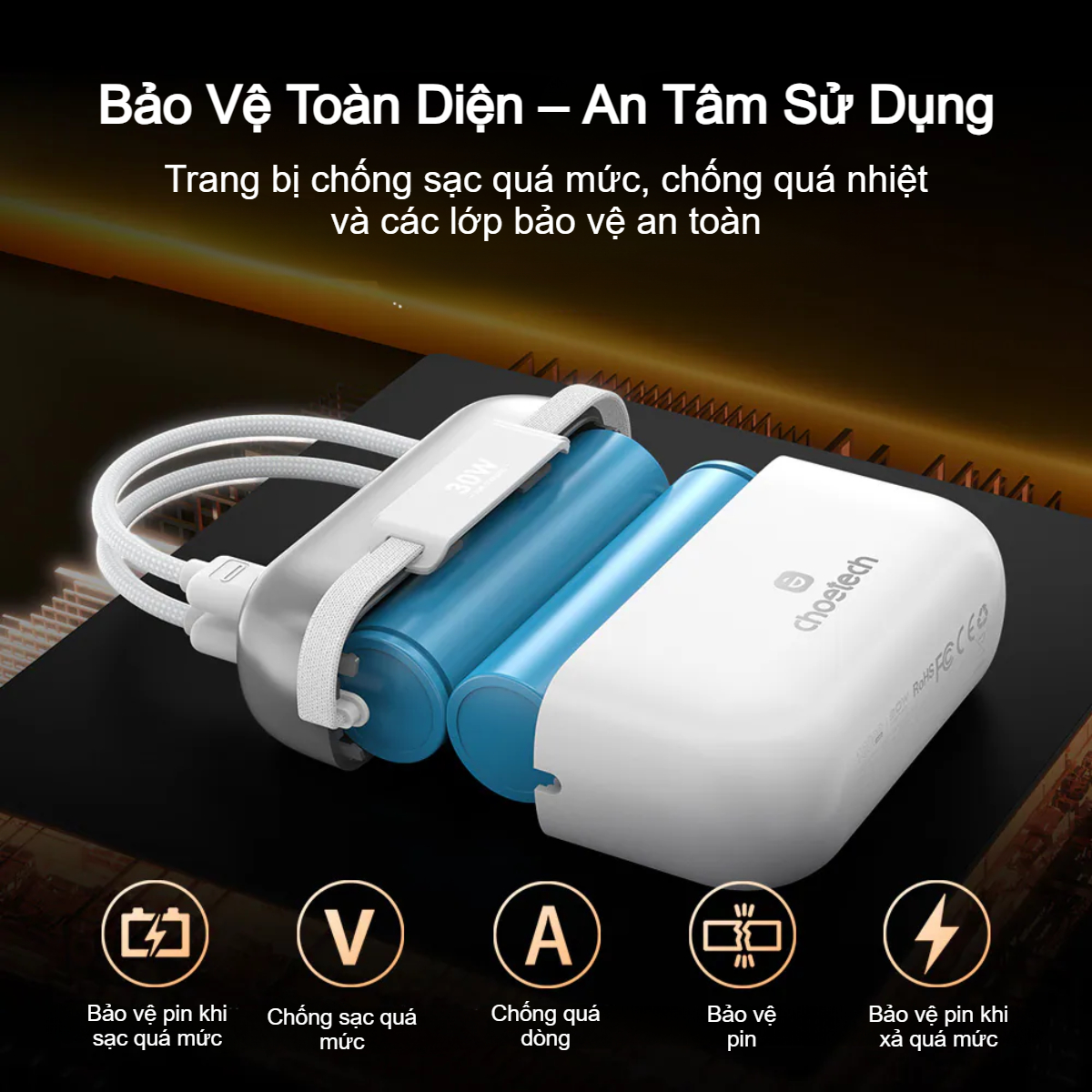 Hình ảnh Pin Dự Phòng Mini 30W Choetech B812 Dung Lượng 10000mAh Tích Hợp Cáp Type C Và iP - Hàng chính hãng.