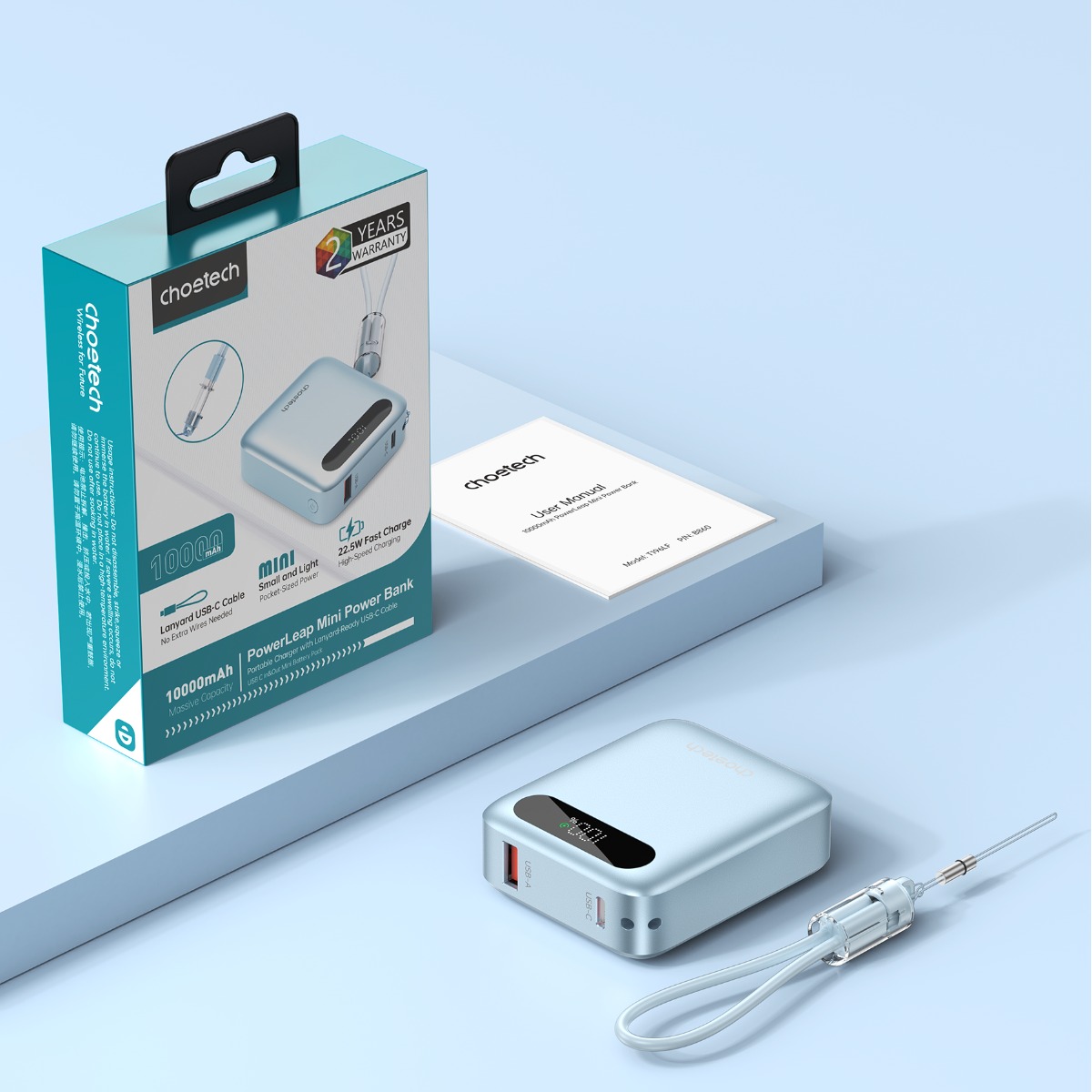 - Choetech B860 còn được tích hợp dây đeo kèm cáp sạc USB C to C, giúp người dùng sạc thiết bị nhanh chóng mà không cần mang theo cáp rời. Thiết kế dây đeo tiện lợi giúp cầm tay chắc chắn, dễ treo balo hoặc túi xách, phù hợp cho những ai thường xuyên di chuyển.