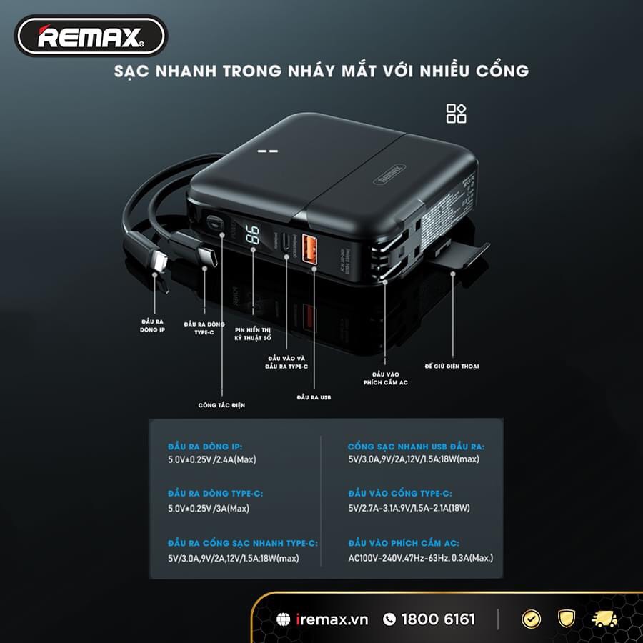 ✪ Củ sạc kiêm pin sạc dự phòng Remax có đầu ra cổng kép USB và đầu Type-C, tương thích với nhiều thiết bị. Ở chế độ pin dự phòng và chế độ củ sạc có 2 dây sạc chân cắm lightning và Type-C thuận tiên khi sạc mà không lo đến dây sạc.
