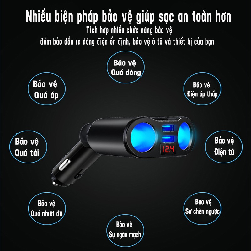 - Vì đây là một sản phẩm đa năng nên bạn sẽ thấy nó sẽ có rất nhiều công dụng. Bộ chi tẩu sạc gồm 2 tẩu sạc, kèm 2 cổng USB, nên bạn có thể sạc 4 thiết bị cùng một lúc, và MỘT MÀN HÌNH LED để hiển thị các thông số điện áp để từ đó có thể lưạ chọn các sợi dây cáp sao cho phù hợp với thiết bị của mình nhất.
